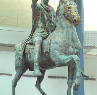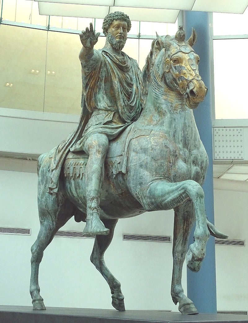 The Equestrian Statue of Marcus Aurelius depicts the Roman Emperor Marcus Aurelius riding a horse. The statue is larger-than-life, standing approximately 4.24 meters (13.9 feet) high. Marcus Aurelius is shown in a relaxed posture, with his right arm extended in a gesture of adlocutio (address or greeting). The horse is portrayed in a walking pose with its right front leg raised.